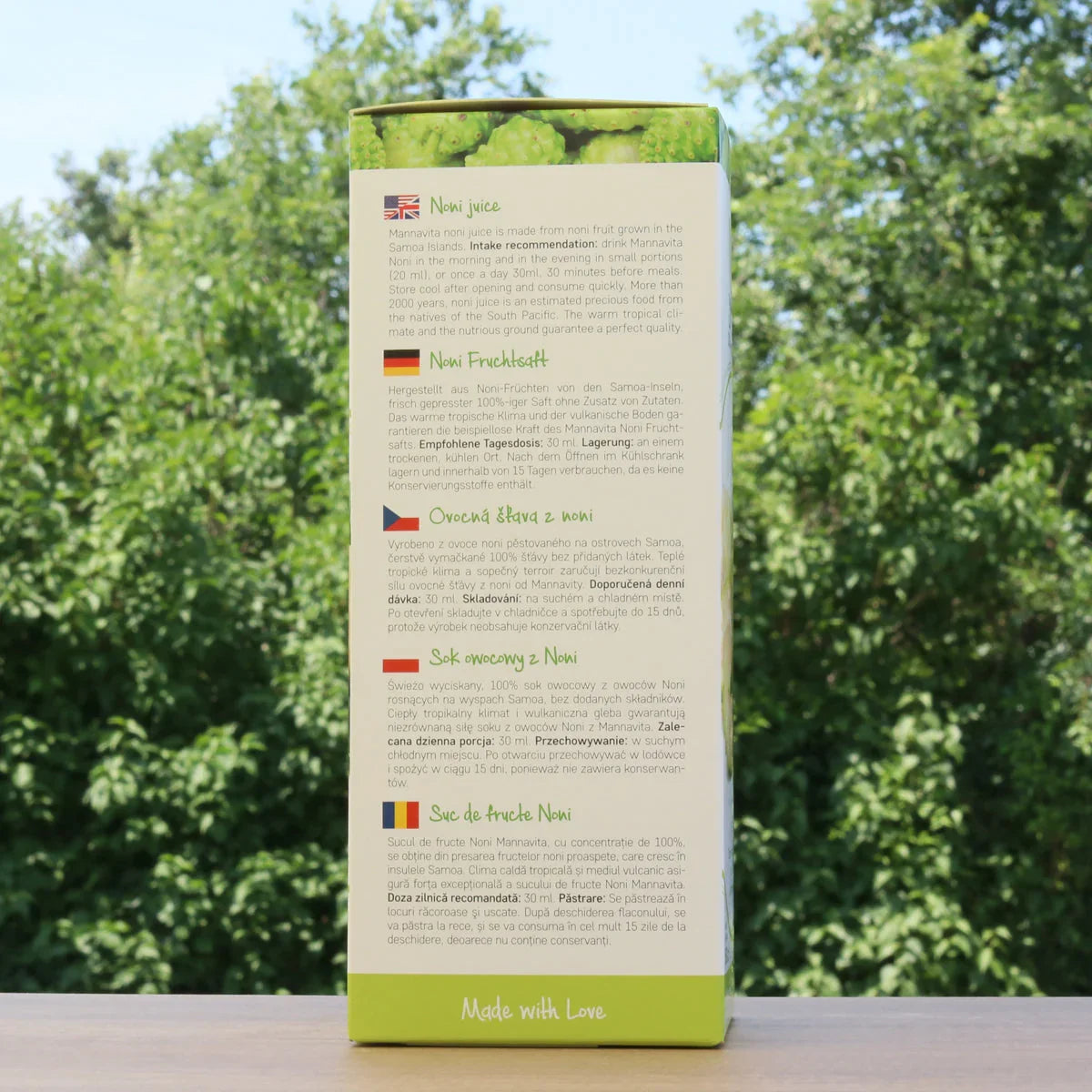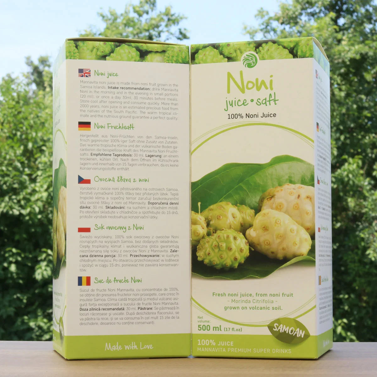 Mannavita 100% Noni juice proizveden je od noni voća uzgojenog u vulkanskom okruženju Samoanskih otoka, korištenjem nježne metode prerade. Ne sadrži dodane tvari, već samo prešani sok noni voća. [01.]